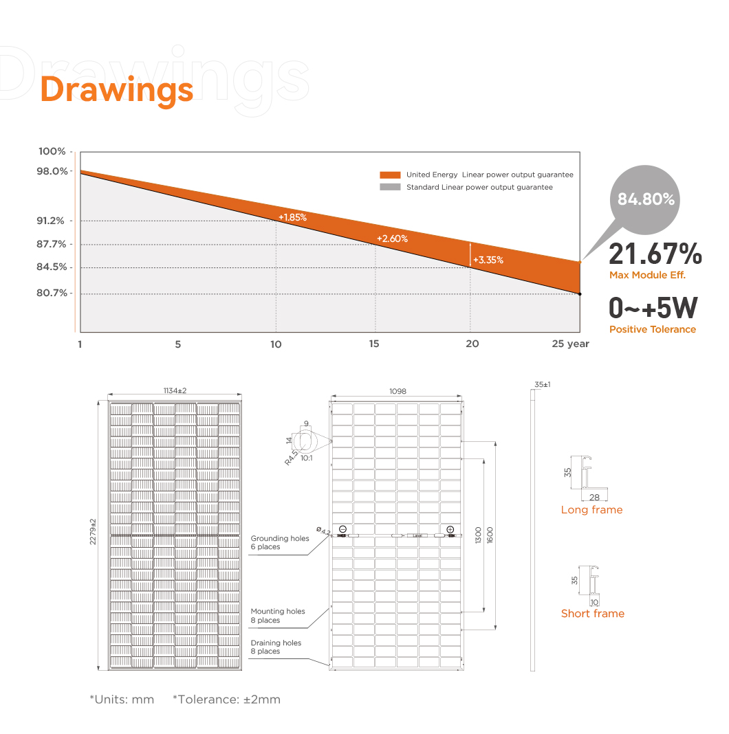 • What type of solar panel is this? This is a 535-560 watt bifacial Solar Panel with a high efficiency of 21.67%, utilizing PERC technology. Manufactured by UE.