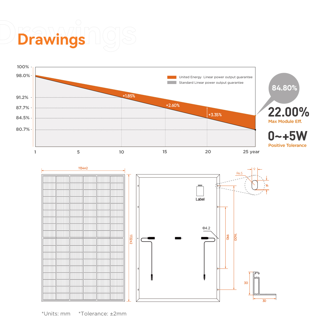 *STC (Standard Testing Conditions): rradiance 1000W/㎡, Cell Temperature 25°C, Spectra at AM1.5